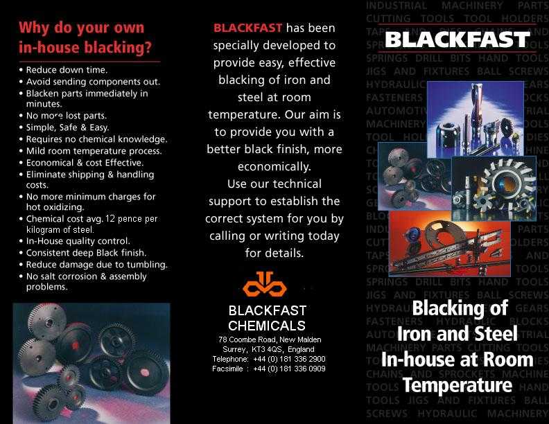 Blackfast is used throughout the metal working industry. The following is a list of some universally known customers and the equipment that they manufacture: Hand tools Sandvik, Bahco, Euro Tools, Footprint Tools, Stanley Tools, Sykes Pikavient, Draper Tools, L.S.Starrett e.g. wrenches, pliers, sockets, spanners, guages, wood working tools, taps, dies, drills.